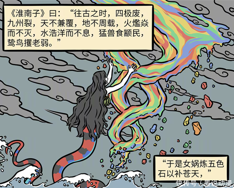 为了补天,女娲用神力炼制五彩石。这就是女娲第一次补天,不过难度很大。除了要用五色石之外,女娲也花费了不少力气,还得稳固这个世界,最终才让这个世界恢复平静。