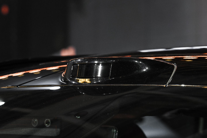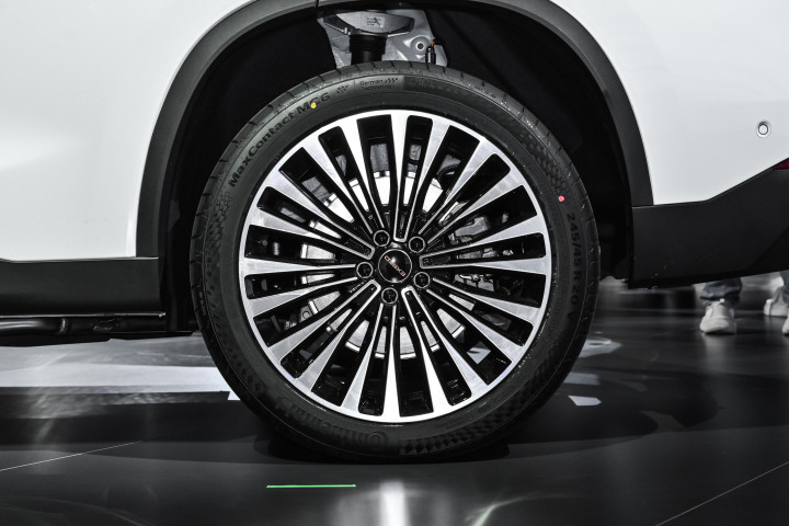 我看的这辆顶配版,车顶还有个激光雷达,但是设计师把它融合得挺好,没有那种突兀的感觉,反而增加了一点科技感。轮毂是 19 英寸的铝合金轮圈,配的是马牌轮胎,抓地力和静音效果都不错。